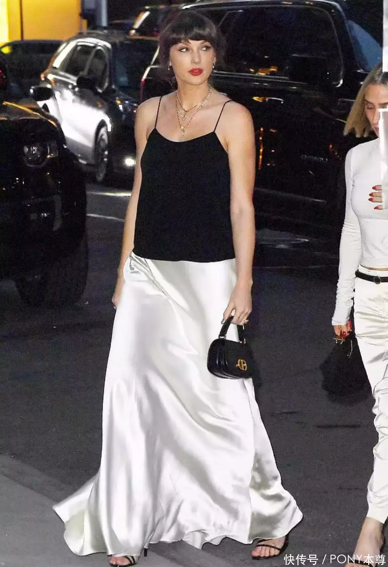 黑色吊带+真丝缎面半身长裙,又酷又甜!